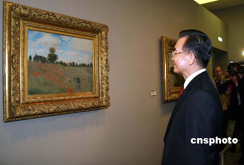 当地时间12月5日傍晚,访法日程排得满满的温家宝总理在奥塞美术馆参加中国向为中法文化年做出贡献的法国人士授勋仪式,并对这座著名的美术馆进行了短暂的“浏览”。图为温总理在该馆欣赏著名印象派大师莫奈的名作。作者:钟诚