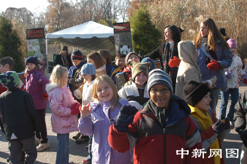 当天华盛顿天寒地冻,但国家动物园熊猫馆前却是喜气洋洋。早上十点多钟,就有不少市民戴着熊猫帽子,顶着寒风,扶老携幼,排队等候进场观看这个五个月大的熊猫宝宝。来自华盛顿的十多位小学生兴高采烈地成为动物园特邀的首批公众参观者。
