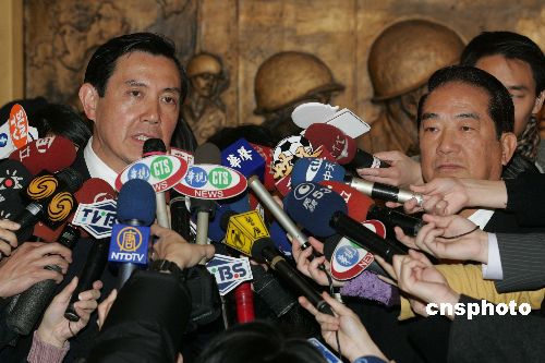 十二月十二日晚,中国国民党主席马英九与亲民党主席宋楚瑜在台北举行县市长选举后的首次会谈,议题涉及国亲两党合并。图为二人在会谈前与记者见面。作者:宗金柱