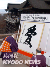 中新网12月13日电 共同社消息,日本每年都要选出一个汉字表示该年的世态。日本汉字能力鉴定协会(京都市)12日在京都市东山区清水寺宣布,反映2005年日本社会世态的“今年的汉字”是“爱”。