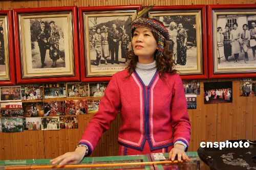 在冬季的台湾名胜日月潭,一位邵族女店主向游人介绍到访名人的照片。她期望开放观光后,有更多的大陆游客光顾她的工艺品小店。作者:宗金柱