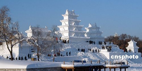 12月19日,第十八届太阳岛雪博会上的大型雪建筑“日式城堡”完工。该雪雕是历届太阳岛雪博会最高、用雪量最大的雪建筑,高27米,长70米,宽30米,总用雪量为5万立方米。此城堡是以日本的广岛城为参考设计的日式城堡。 作者:王东
