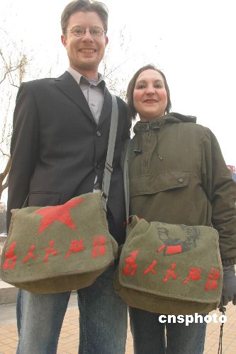 12月20日,来自美国的两位英语教师简和凯特身背由毛泽东题词的“为人民服务”军挎包在济南泉城广场游玩。据他们介绍,他们对中国的毛主席和他的为人民服务的思想十分赞赏,在毛泽东诞辰112周年纪念日到来之际,通过这种方式来纪念这位伟人。 作者:周青先
