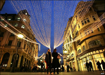 在贝尔格莱德商业购物区高悬的圣诞灯饰
