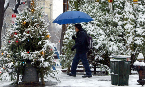 纽约纷飞的白雪正好为圣诞树添上装饰