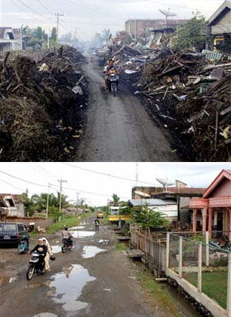 中新网12月23日电 据法新社报道,上图为2005年1月7日,印尼亚齐省米拉务市,一家人骑摩托车在两边都是海啸造成的残骸的小路上通过。下图为2005年1月8日,印尼班达亚齐市民骑摩托路过市区被破坏的街道。(春风)