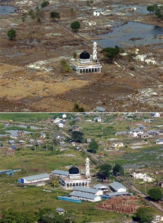 中新网12月23日电 据法新社报道,印尼亚齐省首府班达亚齐的清真寺。上图为2004年海啸发生后,印尼亚齐省首府班达-亚齐的一座清真寺四周房屋被毁,一片狼藉。下图为一年后的今天,班达亚齐的清真寺四周已经重新建起了民居,清真寺也被修缮一新。(春风)