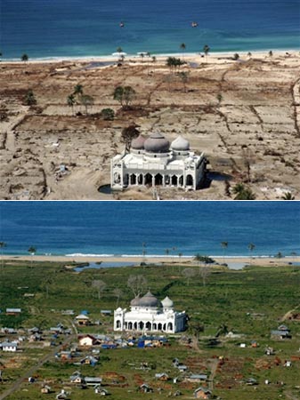 中新网12月23日电 据法新社报道,印尼苏门答腊岛西北部的特罗姆清真寺。上图为2004年海啸发生后,清真寺四周被海水冲毁,大量民房被毁。下图为一年后的今天,灾区人民在废墟上重新修起了自己的家园,清真寺也被修缮一新,焕发出应有的光彩。(春风)