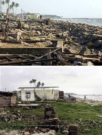 中新网12月23日电 据法新社报道,斯里兰卡莫拉图瓦海滩。上图为2004年海啸发生后,斯里兰卡莫拉图瓦海滩上的房屋被海水冲毁,四周一片狼藉。下图为一年后的今天,灾民们开始在原址重新修建自己的家园。(春风)