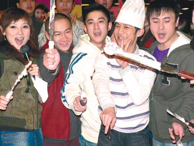 昨天中午,由何炅、于娜、汤加丽、谢娜主演的贺岁话剧《麻花1》在青鸟健身举行了百场演出庆典。2003年末,《麻花1》在京城连续演出了50多场,开启了“麻花”系列贺岁喜剧的演出。昨天,主演何炅特意从长沙赶回北京为《麻花1》庆贺,正在演出《麻花3》的周晓鸥和李莉也一同前来庆祝。何炅说,自从他演出了《麻花1》,演艺事业就有了极大突破,不仅有导演找他来演皇帝,而且张艺谋也邀请他去主持《千里走单骑》的云南首映式。