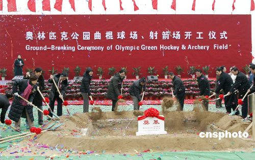 中新社北京十二月二十八日电 (记者 王欢)位于奥林匹克森林公园内的北京二00八年奥运会曲棍球场、射箭场工程今日正式开工,沙滩排球场也于同日在朝阳公园举行了开工奠基仪式。