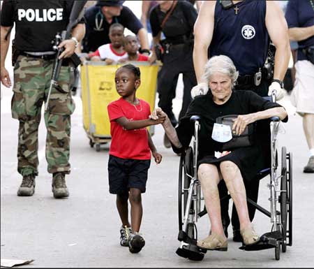 4.患难老少——2005年9月3日,5岁的贝尔文抓着在飓风“卡特里娜”中一同落难的89岁的拉贾德的手,他们一起被从新奥尔良市疏散。(美联社图)