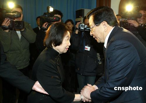 图为曾庆红与前来吊唁汪道涵的辜振甫遗孀辜严倬云握手。 作者:郭天中