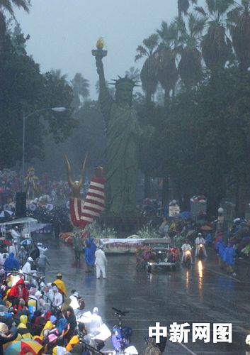 玫瑰花车新年元旦大游行全美闻名,全球转播。今年第一百一十七届不巧按历史规定不能在礼拜天举行,改次日却碰上风雨交加。