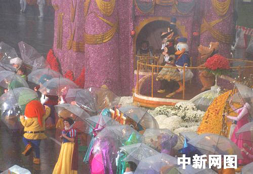 两千万枝玫瑰花装点的四十八辆彩车,于早八点风雨无阻起动,展现“神奇的世界”游行主题。