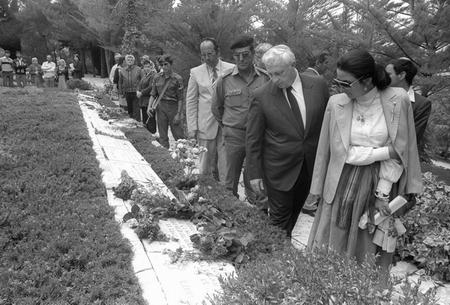 图为以色列政府新闻办公室公布的资料图片,1982年4月27日,时任以色列国防部长沙龙(右二)和妻子利丽(右一)拜祭耶路撒冷赫兹尔山上的以军阵亡士兵墓地。(春风)