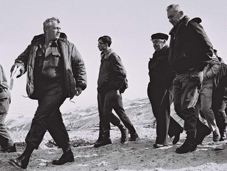 这张以色列政府新闻办公室公布的照片显示,1971年1月27日,时任少将的沙龙(左)护送总理本-古里安和军队要员走在以色列与埃及接壤的边境地带。(春风)