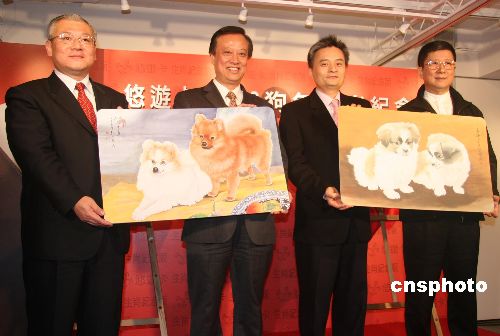 农历新年即将到来,2006年1月8日,台北捷运悠游卡制作商推出狗年生肖纪念卡,限量一千套。图为制作商展示新卡图案,两个版本分别是“LUCK,多多”和“狗来福”,是台湾工笔画学会理事长张克齐的画作。作者:曾嘉