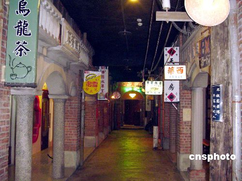 走进“台湾故事馆”,一阵古风迎面扑来。一棵用水泥做成的巨大榕树下,是一个古色古香的亭台。在该馆销售部杨小姐的引领下,我们轻轻推开了木栅门,首先映入眼帘的是馆中的一条古街,漫步其间,令人坠入怀旧的时空。