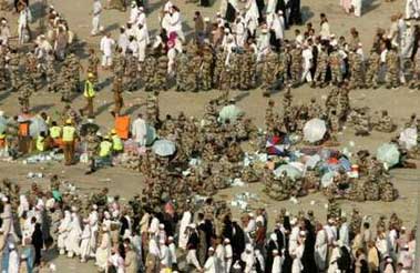 图为营救人员将踩踏现场毁坏的朝拜者物品移走(章田)