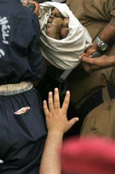 图为一个朝拜者伸出手臂竭力想去触碰遇难亲属的尸体。(章田)
