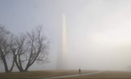 中新网1月16日电 据美国《华盛顿邮报》报道,最近一段时间以来,美国华盛顿地区遭遇罕见的暖冬天气,白天气温高达华氏50多度(华氏10度多)。图为1月12日,公园警官克里斯·劳斯顿在晨雾中在华盛顿纪念碑附近巡逻。(春风)