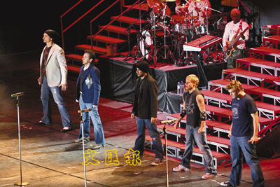 中新网1月18日电 据香港媒体报道,16日晚后街男孩(Backstreet Boys)《HOZ 2006北京演唱会》在首都体育馆火爆开唱。继上次演唱会不到一年半的时间,Backstreet Boys再次站到了首体的舞台上,为北京歌迷献上又一场音乐盛宴。尽管演唱会的舞台设计和五人的服装均略显简单,但这些并未减弱观众的热情,在五个男孩的带动下歌迷唱起了大合唱。