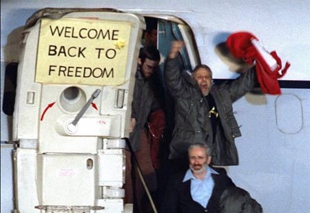 美联社图片:1981年1月21日,一名抵达美军在德国威斯巴登空军基地的获释人质振臂欢呼。卡特总统随后对入住威斯巴登空军基地医院的人质进行了慰问。(章田/雅龙)