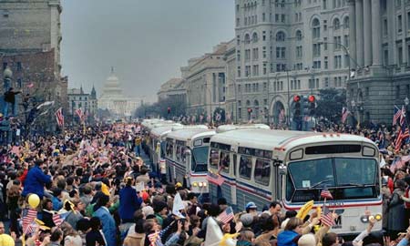 美联社图片:在华盛顿主干道宾夕法尼亚大街上,无数美国民众夹道欢迎归国的人质们,据说这是自二战胜利之后最热烈的欢迎场面。 (章田/雅龙)