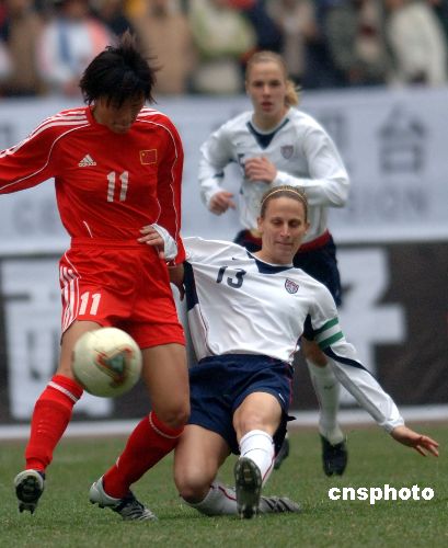 2006女足四国赛昨天下午进入收官比赛日,中国队同美国队展开冠军争夺战,上半时第21分钟,美国队利用点球机会由莉莉破门取得领先,半场结束前莉莉反越位挑射梅开二度,最终美国队2比0胜出。