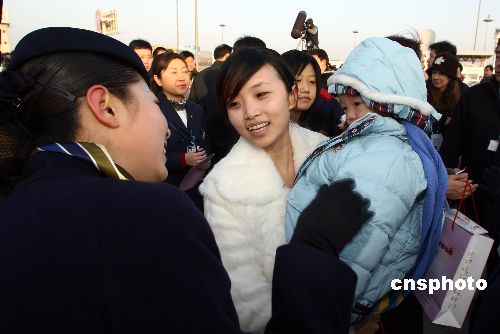 一月二十五日,中国国际航空公司“奥运号”满载一百名台湾同胞,从北京首都国际机场飞往台北,这是北京第一班两岸春节包机航班。图为国航的空姐热情接待乘坐春节包机的台湾同胞。 作者:盛佳鹏