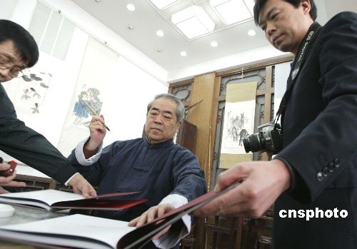 一月二十五日,范曾先生丙戌新作展在荣宝斋举行,共展出他近期力作绘画作品三十九幅、书法作品二十幅。图为范曾先生在为购买书法绘画作品集的读者签名留念。作者:任海霞