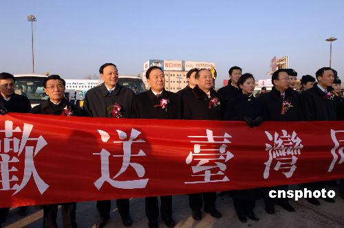 年1月25日上午,国航“奥运号”CA197航班和海航“快乐海浪”HU7965航班先后由首都机场起飞,共运载了230多位台胞前往台北。国务院台办副主任李炳才、民航总局副局长杨国庆、北京市副市长张茅、中航集团总裁李家祥等分别向每一位乘客握手道别,并送上特别精美的"福娃"、“奥运号”彩绘机模型和“年年有鱼”年糕等礼品。作者:马儒壮