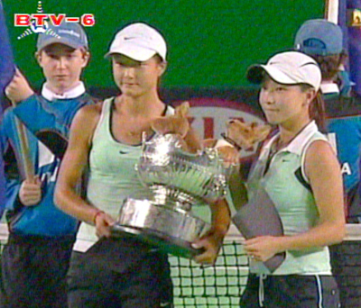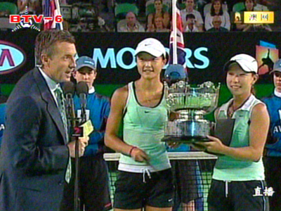 中新网1月27日电 在今天下午结束的澳大利亚网球公开赛女双决赛中,中国选手组合郑洁/晏紫经过三盘苦战,以2-1的比分力克赛会头号种子斯托瑟/雷蒙德,历史性问鼎06年澳网公开赛女双冠军,这是中国女网在今年年初获得的一项重大突破,三盘比分分别是2-6、7-6和6-3。