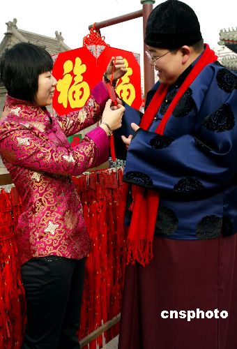元月二十九日大年初一,“第五届北京东岳庙民俗文化节”开幕,一对北京恋人身着中国传统服饰在东岳庙的祈福路为家人和亲朋好友求牌祈福。 作者:张勤