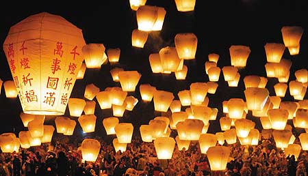台北县平溪天灯节4日晚登场,1800盏天灯,载着民众中乐透彩、身体健康的希望,飘向天际。1800盏大小天灯,分12波次升空。很多人在天灯上写下心愿,有人希望“狗年旺旺旺”,不少人写了“中乐透头彩”、“升官发财”、“财源滚滚”。(台湾《联合报》图)