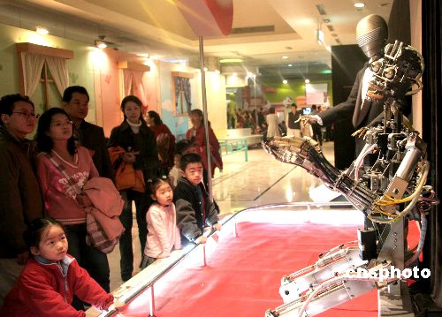 台北“机器人教育展”目前正在信义区新光三越举行。图为五日部分大小朋友在欣赏机器人表演“脱口秀”。作者:黄少华