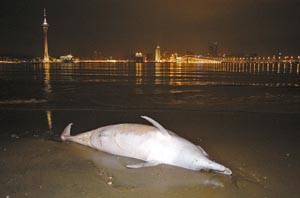 被发现的海豚尸体,由海水冲上氹仔海洋花园大马路对开岸边一处浅滩,该白海豚身长约一米七十,全身白色,相信为成年海豚。海豚尸体并无明显伤痕,只是尾部及局部外皮脱落,可能死去后被海浪冲上岸边时造成,尸体传出轻微臭味,估计死去时间较短。