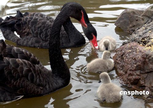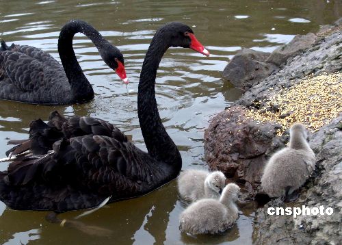 | 2月5日,3只“丑小鸭”随着黑天鹅父母觅食。入春以来,重庆野生动物世界天鹅湖里多了3只幼雏黑天鹅,它们跟在黑天鹅父母身边,时而觅食,时而嬉戏。黑天鹅是观赏鸟类珍贵品种,体重5-8公斤,全身羽毛深黑,嘴为深红色,头颈约占全身总长的一半,翅上长有如风帆一般卷曲的婚羽,极为美丽。幼雏1-3天后可随亲鸟下水活动,在亲鸟带领下觅食,不过它们还是穿着一件灰色外套,就是人们常说的“丑小鸭”。“丑小鸭”绒毛换成羽毛的顺序为头——翅——全身。最初的绒毛呈浅灰色,以后换成灰黑色,颜色逐渐变黑,嘴变红且尖端可见白斑,最后变成成年黑天鹅一样的黑色。作者:陈仕川