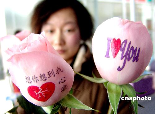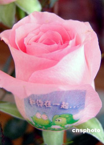 2月6日,郑州花卉市场内,一种印上美丽卡通图案和情话的玫瑰特别受欢迎。这种玫瑰花上的图案是用特制打印机打上去的,可以根据顾客的需要打印包括照片在内的所有内容。 作者:马健