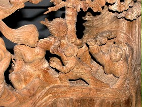 木雕上方出现一堆巨浪,中间有个表情惊恐的人头,这是落难者逃跑不及,被狂浪卷起后拋向空中。