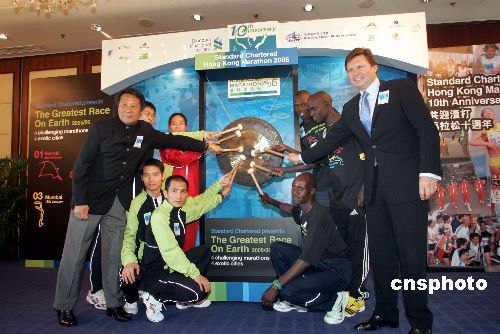 2月10日,渣打银行(香港)有限公司行政总裁苏利民先生(Peter Sullivan)( 右前排一)联同香港业余田径总会主席高威林先生(左前排一)与一众海外的参赛选手一同敲响身后的铜锣,为将在周日举行的渣打马拉松赛造势宣传。作者:洪少葵