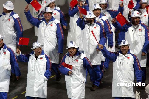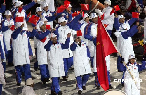 2月10日,第20届冬奥会在意大利都灵奥林匹克体育场开幕,开幕式以“激情、意大利的未来和活力动感”为主题。图为中国代表团入场。作者:武仲林