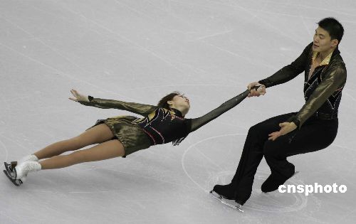备受关注的申雪/赵宏博第六位出场,他们的第一个难度动作就是曾使赵宏博受伤的后外点冰三周单人跳。赵宏博今天成功克服了这一动作,让人们放下了悬着的心;然而申雪却意外出现失误,落地时重心不稳手扶冰,留下了些许遗憾。多少受到脚伤的影响,赵宏博在最后一个螺旋线动作点冰的时出现滑动,但两人还是比较圆满地完成了整套动作,以总分六十二点三二分暂时排在所有二十对选手中的第五位。