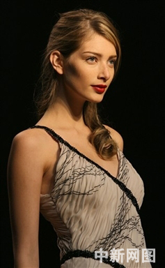2006年2月14日,伦敦时装周在伦敦自然历史博物馆开幕。图为模特在时装周开幕第一天展示设计师Amanda Wakeley的作品。