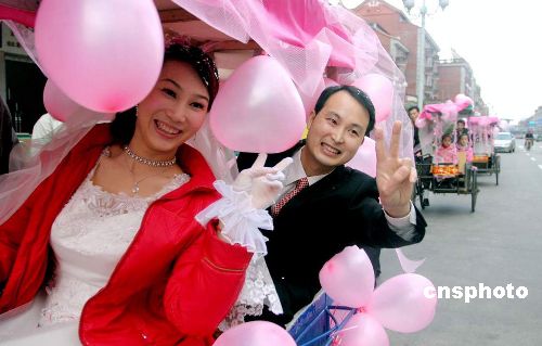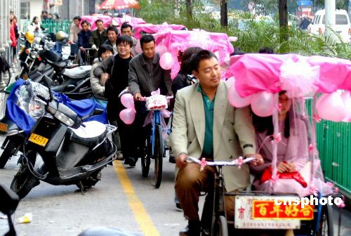 2006年2月19日,一对在福建泉州举行婚礼的年轻人,租用9辆三轮车做婚车,婚车一路行进,引得路人好奇观望。据悉,泉州人结婚多使用“宝马”轿车做婚车,该做法显然与众不同。作者:凌晓枫