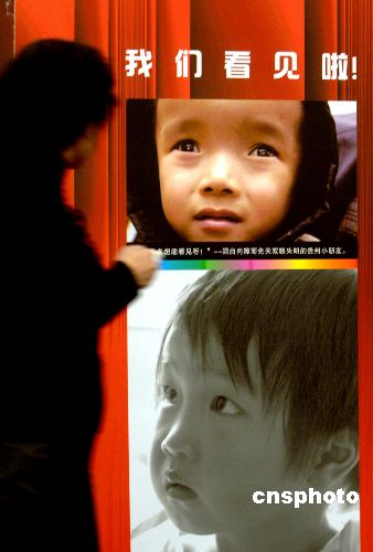 3月2日,一名参会人员观看“健康快车”为贫困白内障患者重见光明的图片展板。自1997至2005年底,香港同胞捐赠内地、免费为贫困白内障患者实施复明手术的三列列车医院已在中国的20个省、自治区、直辖市56个地区,使54225名白内障患者重见光明。 作者:韩艺冰