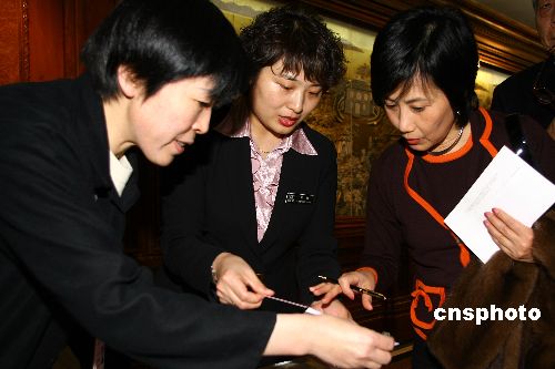 三月二日下午,参加全国政协十届四次会议的香港特别行政区的全国政协委员抵达北京,著名演员汪明荃(右)在驻地酒店领取参会证件。作者:盛佳鹏