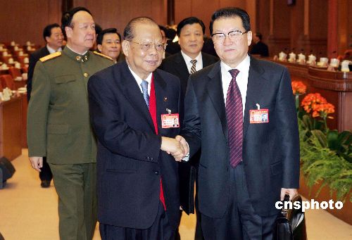 图:李长春与曾宪梓在人大主席团会议上交谈