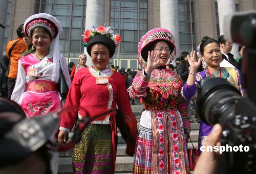 三月五日,十届全国人大四次会议在北京开幕。身着民族服饰的人大代表会后兴高采烈步出人民大会堂。作者:廖文静